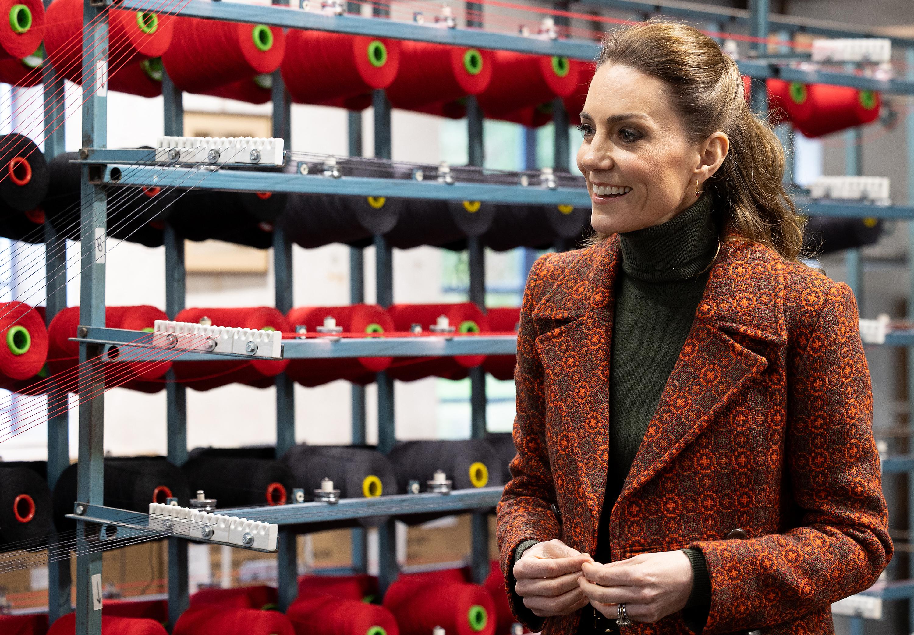 Ce mardi 3 février, Kate Middleton célèbre l’héritage, la créativité et l’artisanat local. La princesse de Galles a fait une apparition remarquée lors d’une visite chez Hiut Denim, une entreprise familiale basée à Cardigan. Pour l’occasion, l’épouse du prince William avait opté pour une silhouette élégante et parfaitement maîtrisée : un pantalon flare gris, une veste longue de tailleur aux motifs marron et cuivrés subtilement travaillés, et un col roulé sobre porté en dessous. Une tenue chic et contemporaine, en parfaite harmonie avec l’esprit du lieu.
